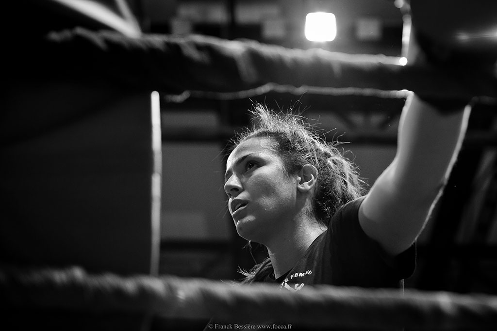 Le choix du noir et blanc s’est imposé, notamment à cause de l’environnement aux éclairages multiples (jaunes, blanc, tungstène). Un autre avantage de cette option : harmoniser l’ensemble du reportage. Le traitement des photos, avec des noirs denses, est en total accord avec l’ambiance inhérente à un sport de combat.